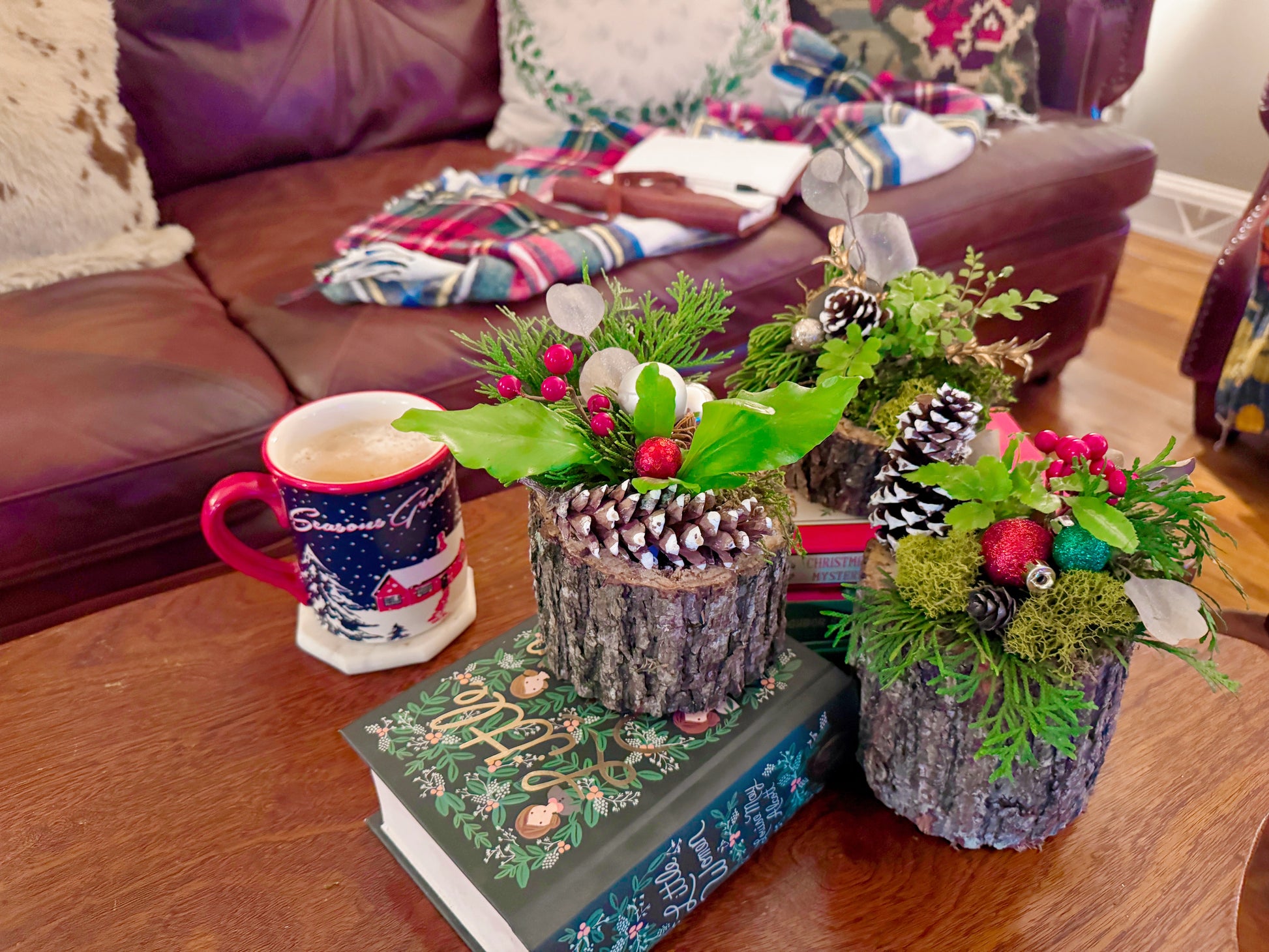 Each piece feels like a walk through the woods — lush evergreens, bits of sparkle, and that nostalgic holiday scent that fills the air. These woodland creations look perfect on a mantel, table centerpiece, or tucked into a bookshelf to bring the magic of the season indoors.